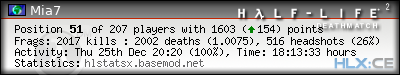 | Rank | Server | Kills | % | Ratio | Deaths | K:D | Headshots | Percentage of Headshots | % | HS:K |