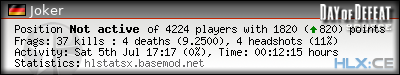 Rank | Server | Kills | % | Ratio | Deaths | K:D | Headshots | Percentage of Headshots | % | HS:K |