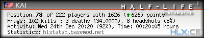| Rank | Server | Kills | % | Ratio | Deaths | K:D | Headshots | Percentage of Headshots | % | HS:K |