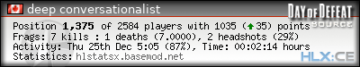 | Rank | Map | Kills | % | Ratio | Deaths | % | Ratio | K:D | Headshots | % | Ratio | HS:K |