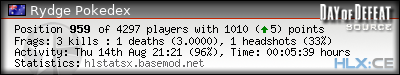 Rank | Map | Kills | % | Ratio | Deaths | % | Ratio | K:D | Headshots | % | Ratio | HS:K |
