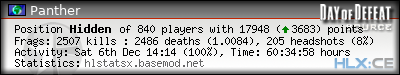 | Rank | Server | Kills | % | Ratio | Deaths | K:D | Headshots | Percentage of Headshots | % | HS:K |