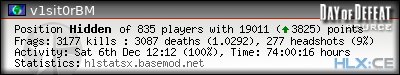 | Rank | Server | Kills | % | Ratio | Deaths | K:D | Headshots | Percentage of Headshots | % | HS:K |