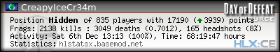 | Rank | Server | Kills | % | Ratio | Deaths | K:D | Headshots | Percentage of Headshots | % | HS:K |