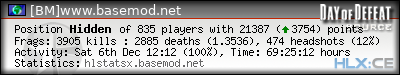| Rank | Server | Kills | % | Ratio | Deaths | K:D | Headshots | Percentage of Headshots | % | HS:K |