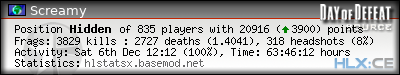 | Rank | Server | Kills | % | Ratio | Deaths | K:D | Headshots | Percentage of Headshots | % | HS:K |