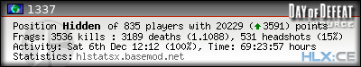 | Rank | Server | Kills | % | Ratio | Deaths | K:D | Headshots | Percentage of Headshots | % | HS:K |