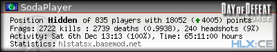 | Rank | Server | Kills | % | Ratio | Deaths | K:D | Headshots | Percentage of Headshots | % | HS:K |
