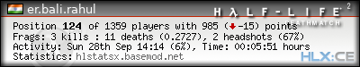 | Rank | Map | Kills | % | Ratio | Deaths | % | Ratio | K:D | Headshots | % | Ratio | HS:K |