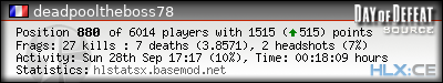Rank | Server | Kills | % | Ratio | Deaths | K:D | Headshots | Percentage of Headshots | % | HS:K |