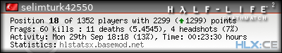 | Rank | Server | Kills | % | Ratio | Deaths | K:D | Headshots | Percentage of Headshots | % | HS:K |