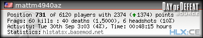 | Rank | Server | Kills | % | Ratio | Deaths | K:D | Headshots | Percentage of Headshots | % | HS:K |