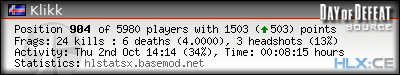 Rank | Server | Kills | % | Ratio | Deaths | K:D | Headshots | Percentage of Headshots | % | HS:K |