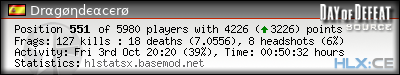 Rank | Server | Kills | % | Ratio | Deaths | K:D | Headshots | Percentage of Headshots | % | HS:K |