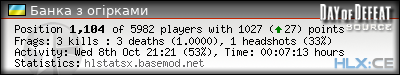 Rank | Map | Kills | % | Ratio | Deaths | % | Ratio | K:D | Headshots | % | Ratio | HS:K |