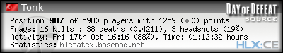 Rank | Server | Kills | % | Ratio | Deaths | K:D | Headshots | Percentage of Headshots | % | HS:K |