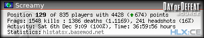 | Rank | Server | Kills | % | Ratio | Deaths | K:D | Headshots | Percentage of Headshots | % | HS:K |