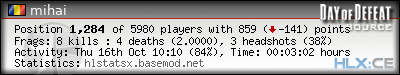 Rank | Map | Kills | % | Ratio | Deaths | % | Ratio | K:D | Headshots | % | Ratio | HS:K |