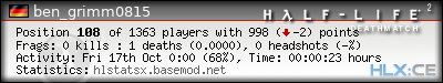 | Rank | Map | Kills | % | Ratio | Deaths | % | Ratio | K:D | Headshots | % | Ratio | HS:K |