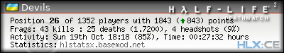 | Rank | Server | Kills | % | Ratio | Deaths | K:D | Headshots | Percentage of Headshots | % | HS:K |