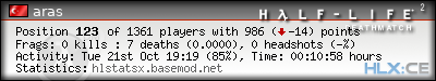 | Rank | Map | Kills | % | Ratio | Deaths | % | Ratio | K:D | Headshots | % | Ratio | HS:K |