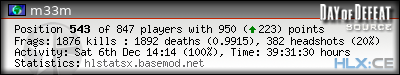 | Rank | Server | Kills | % | Ratio | Deaths | K:D | Headshots | Percentage of Headshots | % | HS:K |