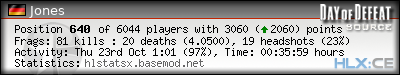 | Rank | Server | Kills | % | Ratio | Deaths | K:D | Headshots | Percentage of Headshots | % | HS:K |