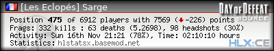 | 1 | [Les Eclopés] Sarge | 0d 00:51:57h | 2025-11-16 21:03:31 | 114 | 42 | 2.71 | 31 | 0.27 | 0 | 32.0% |