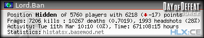 | Rank | Server | Kills | % | Ratio | Deaths | K:D | Headshots | Percentage of Headshots | % | HS:K |