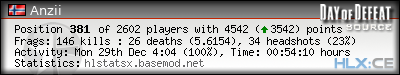 | Rank | Server | Kills | % | Ratio | Deaths | K:D | Headshots | Percentage of Headshots | % | HS:K |