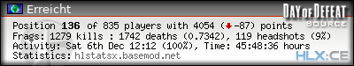 | Rank | Server | Kills | % | Ratio | Deaths | K:D | Headshots | Percentage of Headshots | % | HS:K |