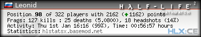 | Rank | Server | Kills | % | Ratio | Deaths | K:D | Headshots | Percentage of Headshots | % | HS:K |
