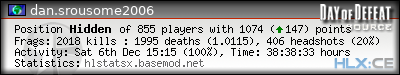 | Rank | Server | Kills | % | Ratio | Deaths | K:D | Headshots | Percentage of Headshots | % | HS:K |