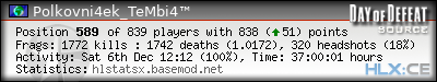 | Rank | Server | Kills | % | Ratio | Deaths | K:D | Headshots | Percentage of Headshots | % | HS:K |