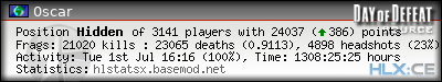| Rank | Server | Kills | % | Ratio | Deaths | K:D | Headshots | Percentage of Headshots | % | HS:K |