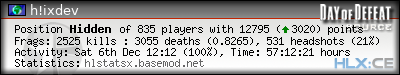 | Rank | Server | Kills | % | Ratio | Deaths | K:D | Headshots | Percentage of Headshots | % | HS:K |