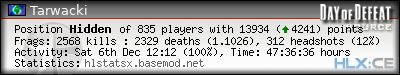 | Rank | Server | Kills | % | Ratio | Deaths | K:D | Headshots | Percentage of Headshots | % | HS:K |