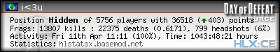 | Rank | Server | Kills | % | Ratio | Deaths | K:D | Headshots | Percentage of Headshots | % | HS:K |