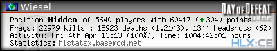 | Rank | Server | Kills | % | Ratio | Deaths | K:D | Headshots | Percentage of Headshots | % | HS:K |