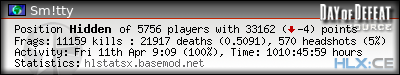 | Rank | Server | Kills | % | Ratio | Deaths | K:D | Headshots | Percentage of Headshots | % | HS:K |