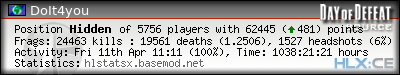 | Rank | Server | Kills | % | Ratio | Deaths | K:D | Headshots | Percentage of Headshots | % | HS:K |