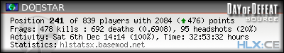| Rank | Server | Kills | % | Ratio | Deaths | K:D | Headshots | Percentage of Headshots | % | HS:K |