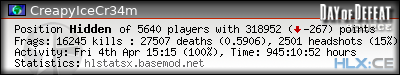 | Rank | Server | Kills | % | Ratio | Deaths | K:D | Headshots | Percentage of Headshots | % | HS:K |