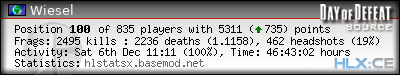| Rank | Server | Kills | % | Ratio | Deaths | K:D | Headshots | Percentage of Headshots | % | HS:K |