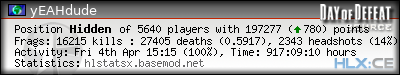 | Rank | Server | Kills | % | Ratio | Deaths | K:D | Headshots | Percentage of Headshots | % | HS:K |