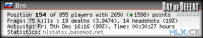 | Rank | Server | Kills | % | Ratio | Deaths | K:D | Headshots | Percentage of Headshots | % | HS:K |