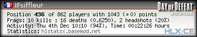 | Rank | Server | Kills | % | Ratio | Deaths | K:D | Headshots | Percentage of Headshots | % | HS:K |