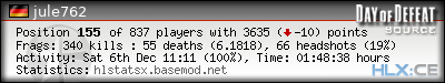 | Rank | Server | Kills | % | Ratio | Deaths | K:D | Headshots | Percentage of Headshots | % | HS:K |