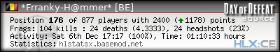 | Rank | Map | Kills | % | Ratio | Deaths | % | Ratio | K:D | Headshots | % | Ratio | HS:K |