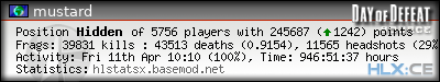 | Rank | Server | Kills | % | Ratio | Deaths | K:D | Headshots | Percentage of Headshots | % | HS:K |
